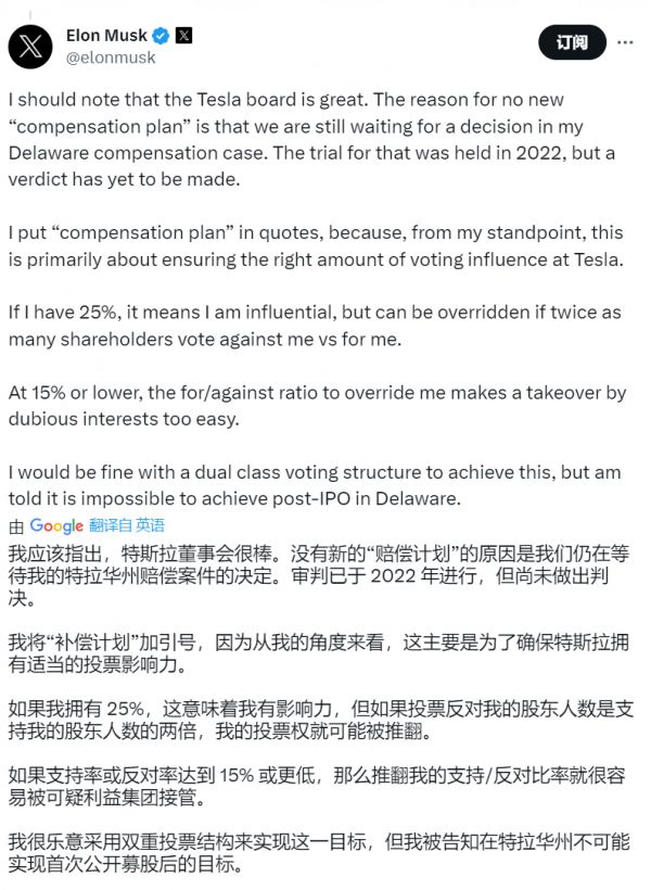 与许多科技公司不一样,特斯拉没有采用AB股形式,核心团队并没有超级投票权,而是以普通股计算。如今,经历过多次套现(尤其是收购推特)后,马斯克在特斯拉的股权占比下降到13%,他担心容易有“利益集团“组织起超过15%的投票权,对他的控制权形成威胁。