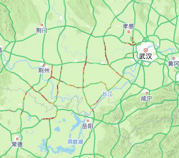 2月7日上午9点导航地图显示武汉西侧仍有大面积拥堵路段