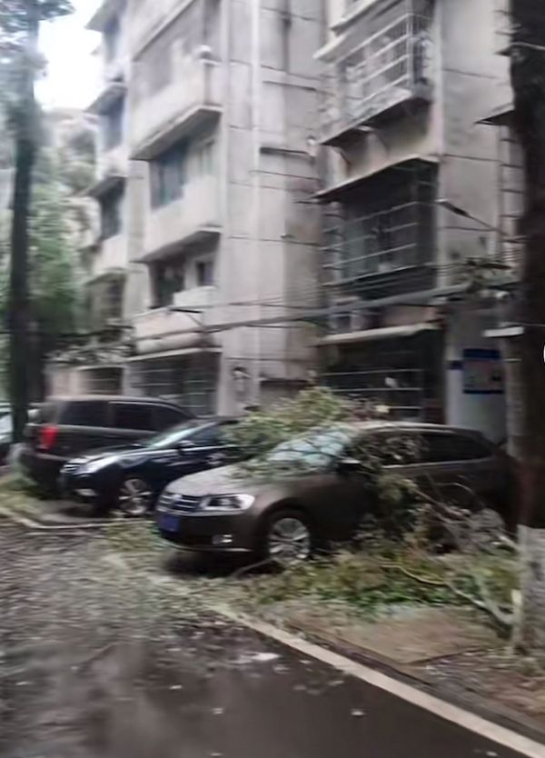 图片来源:采访者供图,2月6日长沙市某小区里被冻雨压倒的树木砸到车辆上