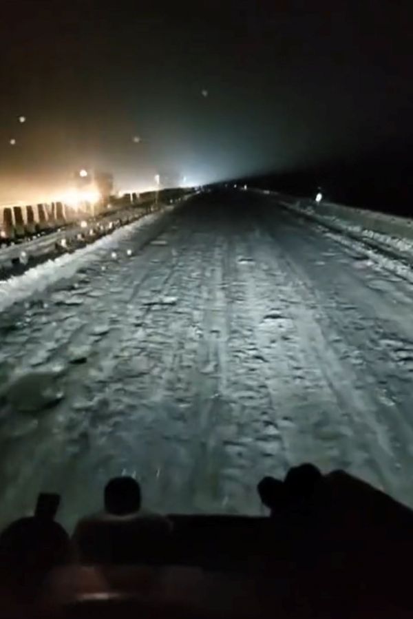 图片来源:受访者供图,2月6日夜,货车在凿出冰窟窿的湖北高速路面上行驶