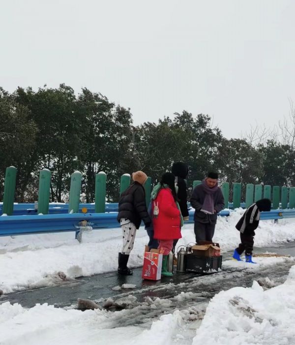 湖北高速公路沿线的不少村民,或自发,或经当地政府组织,准备了热水、饭菜,送到高速公路边,提供给被困人员。
