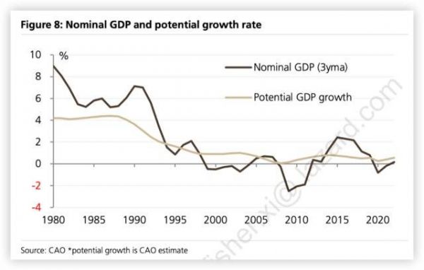 但随着20世纪80年代后半期房地产泡沫破裂,日本银行业的天量房地产商业贷款沦为坏账,冲击金融体系和实体产业,日本的土地价格进入了漫长的下跌历程,朝歌夜弦的昭和岁月终结:过去30年日本GDP年均增长率仅为1%甚至更低。而名义GDP则更加低迷,1991年至2022年期间,名义GDP几乎没有任何增长。