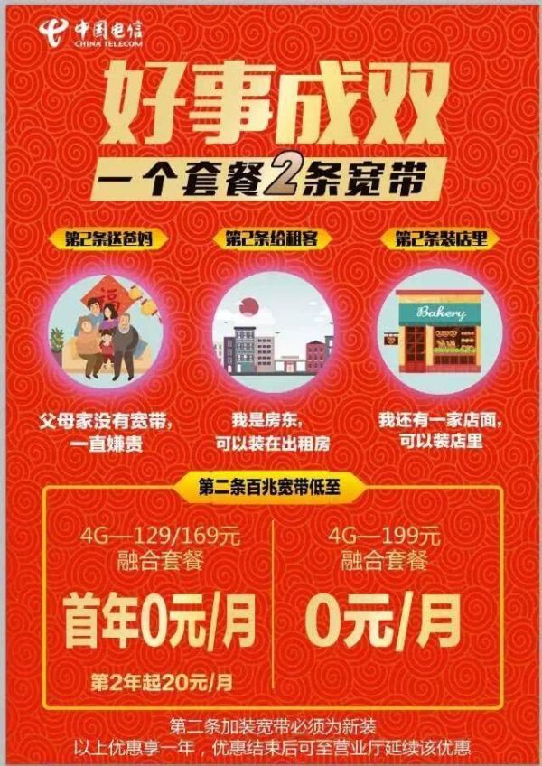 另外,部分运营商还会推广类似于暑假、寒假宽带类的短期网络服务,如果只是过年期间用网的话,可以考虑下这类方案。同时,电信等运营商还搞过“副宽带”之类的活动,用户可以额外办理一条免费宽带,不过这类活动往往会要求只能在同一地市办理,比较适合在家乡本地工作的人。