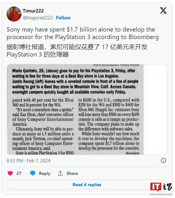 消息称索尼 PS3 处理器开发成本高达 17 亿美元,导致首发价过高