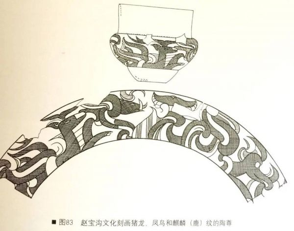 从濮阳西水坡遗址向北行1000多公里,我们的视线,又回到了龙的起点。继查海巨石龙之后,赤峰敖汉旗赵宝沟文化遗址又出土了一件龙纹陶尊。轻轻抚去6000年的落尘,时光流逝了色彩的艳丽,隐约在斑驳中的精神印记,却依旧被精湛的工艺保守得那么清晰,线条流畅自信,布局豪华,猪头龙、鹿头龙、鹰首龙遨游云端,参差透视的画面组合,来自高贵的神性艺术修养。