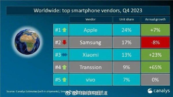 【#苹果超三星成全球手机市场份额第一##小米稳居全球手机市场份额第三#】2023年第四季度,全球智能手机市场增长 8%,达到 3.2 亿部。结束了连续七个季度的下滑。在新款iPhone推出后,苹果在第四季度以 24% 的市场份额领跑全球。三星以 17% 的市场份额,位居第二。小米稳居第三,第四季度同比增长超过 20%。得益于新兴市场的复苏,传音首次晋升至第四位。vivo 以 7% 的市场份额跻身前五。(Canalys)