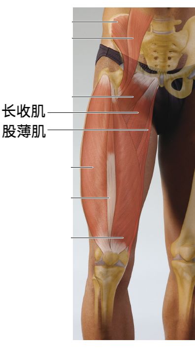髋关节的内收肌位于大腿内侧,从骨盆延伸到膝盖,它不是一块肌肉,而是具有类似功能的一组肌肉,包括大收肌、长收肌、短收肌和股薄肌等。内收肌的主要作用是髋关节内收(让腿靠近中线,如用右脚向左侧踢球)和脚着地时稳定骨盆(如右脚踢球时,依靠左腿在地面上站稳)。