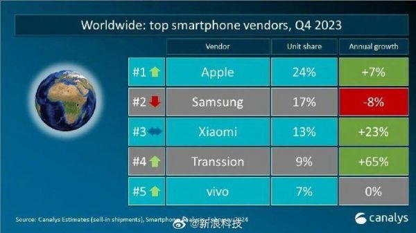 【#苹果超三星成全球手机市场份额第一##小米稳居全球手机市场份额第三#】2023年第四季度,全球智能手机市场增长 8%,达到 3.2 亿部。结束了连续七个季度的下滑。在新款iPhone推出后,苹果在第四季度以 24% 的市场份额领跑全球。三星以 17% 的市场份额,位居第二。小米稳居第三,第四季度同比增长超过 20%。得益于新兴市场的复苏,传音首次晋升至第四位。vivo 以 7% 的市场份额跻身前五。(Canalys)