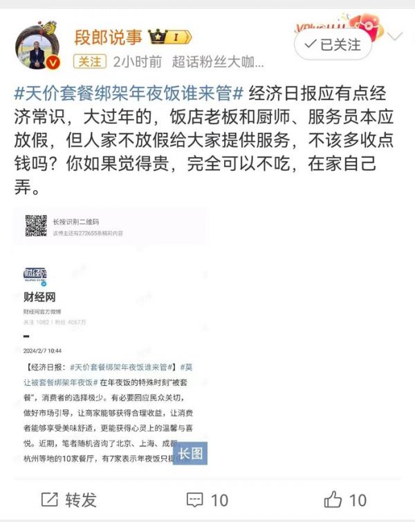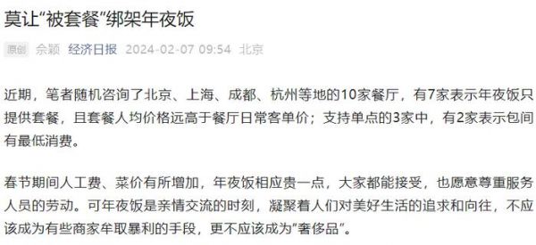 《莫让“被套餐”绑架年夜饭》的雄文,搞得餐饮业老板们瑟瑟发抖。但是,这一“锤”没有赢得一片喝彩,网友评论中批评“管得太宽了”居多。