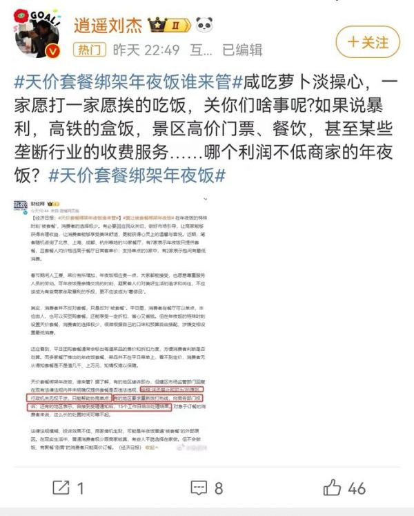 吐槽餐饮行业年夜饭是牟取暴利,《经济日报》记者佘颖又翻车?