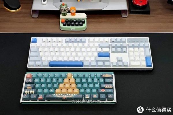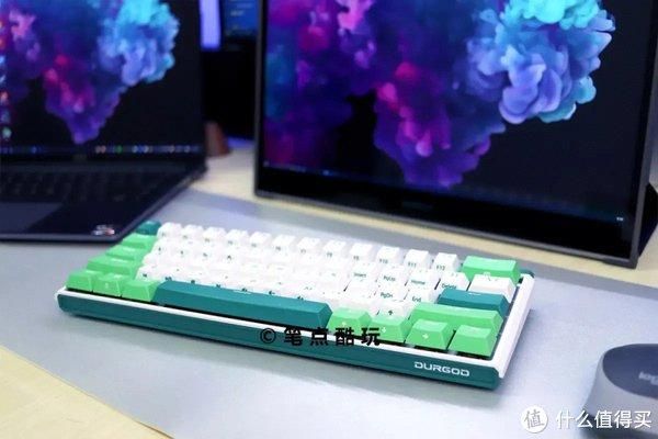 ▲下面那块61键的键盘是码农专属的杜伽K330w,键帽非原厂,是另换的洛斐的OEM高度法老金字塔主题。▼ 没换之前它长这样:原厂“薄荷糖”配色键帽清新有佳,缺憾是无灯,也无法更换键轴。想玩客制化轴体的话,可以选择K330W PLUS。