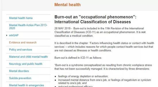 2019年5月28日,世界卫生组织正式将“职业倦怠症”定义为一种“职业现象”并收录于《国际疾病分类》当中 | WHO官网