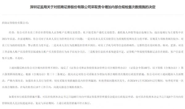 值得一提的是,证监会还对负有从业人员管理责任的招商证券,采取责令增加合规检查次数的行政监管措施,对公司董事长采取出具警示函、2名时任合规总监采取监管谈话的行政监管措施,并督促招商证券启动内部问责,约谈相关违规人员,落实问责全覆盖。
