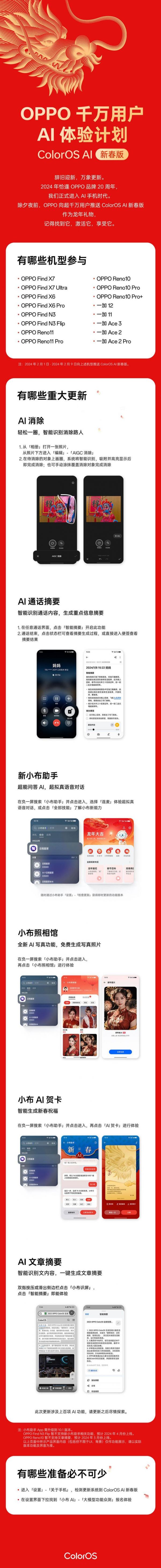 此次 ColorOS AI 新春版升级覆盖机型包括 Find X7 系列、Reno10 系列、Find X6 系列、Find N3 系列、一加 12、一加 11、一加 Ace 3、Reno11、Reno11 Pro、一加 Ace 2、Ace 2 Pro 等近 20 款机型。