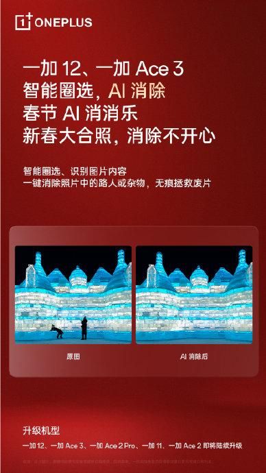 [小黄人微笑]当然对于加人们来说,这不算特别的了。因为一加 12、一加 Ace 3 等机型都已经更新支持 AI 大模型了啦,普及速度也是刚刚的。AI 大模型现在最特出的就是 OPPO 的 AIGC 消除,可以很方便地消除路人或者是不想要的东西,补全照片呈现出更好地效果。并且 AI 大模型还在看不着的性能、续航、屏幕调控等底层,都有优化帮助滴。