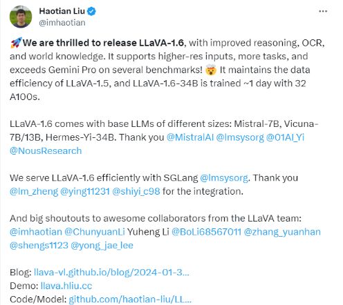 LLaVA-1.6的研发团队成员Haotian Liu在X平台发文原文