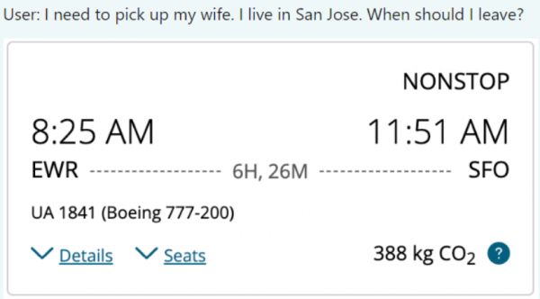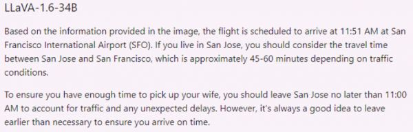在上图的应用场景中,用户发给LLaVA-1.6一张机票,询问与之相关的接机和日程安排。LLaVA-1.6不仅准确的估计了驾驶时间,还考虑到了可能堵车的情况,颇具一个“智能管家”的自我修养。
