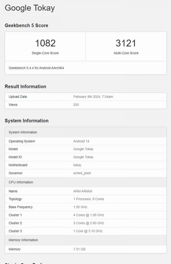目前在GeekBench 5上出现了“Google Tokay”的设备,搭载的便是谷歌最新自研的Tensor G4芯片,只不过这款手机究竟属于谷歌新款手机中的哪一个型号还不知道。从GeekBench 5的跑分来看,Tensor G4芯片拥有一颗3.1GHz的芯片,或许是Cortex-X4以及X5超大核,此外搭载三颗频率为2.6GHz的A700系列处理器与四颗1.95GHz的小核,总共为8核,看起来现在大部分的手机采用了八核的配置,从内存上来看,如今的测试手机仅有8GB的内存,这对于一款旗舰手机来说显然不够多。