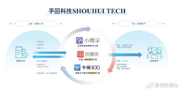 2015年手回科技成立,主要通过旗下的三个业务主体来进行对外业务开展。其中“小雨伞”平台主要是面向保险客户,进行直接保险产品销售;“咔嚓保”主要面向代理人,提供营销科技解决方案;而“牛保100”则是负责为合作伙伴搭建数字化交易解决方案。