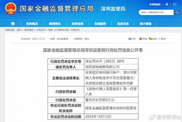 而就在刚刚过去的2023年12月,小雨伞成员中的另一家公司,创信保险销售有限公司因为未按规定使用银行账户;部分互联网人身保险业务不符合监管要求;未按规定建立或者管理业务档案等原因被深圳监管局处以警告并罚款5万元,公司总经理黄龙也因此被处罚3万元。