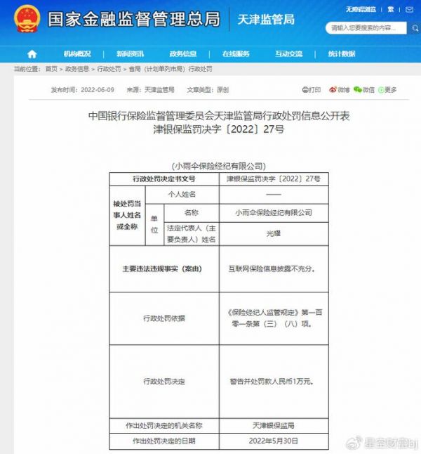 在2022年小雨伞又因为互联网保险信息披露不充分被天津银保监局警告并处以1万元罚款。