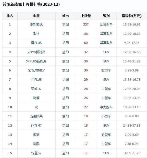 2023年12月益阳市上险数据。数据来源:车主之家