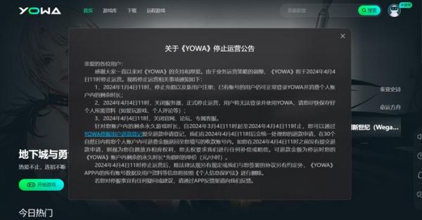 2、2024 年 4 月 4 日 11 时,关闭服务器,正式停止运营,用户将无法登录并使用 YOWA,请尽快保存好个人所需资料(如爱玩游戏、个人评论等);