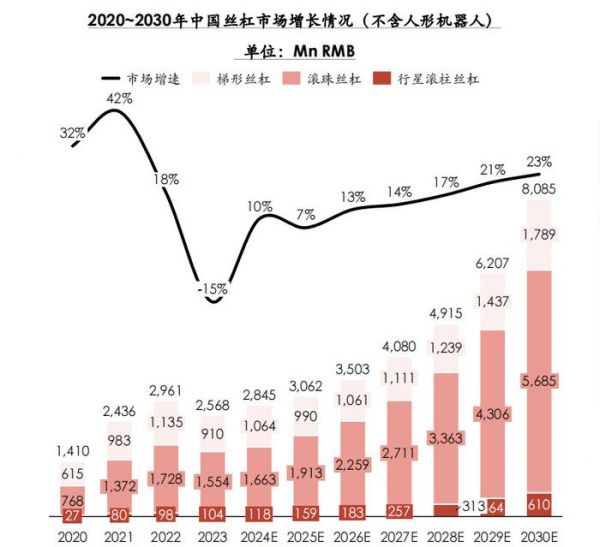 因此梯形丝杠的主要增长,依赖于传统制造业,2030年以前年增速在10%左右。