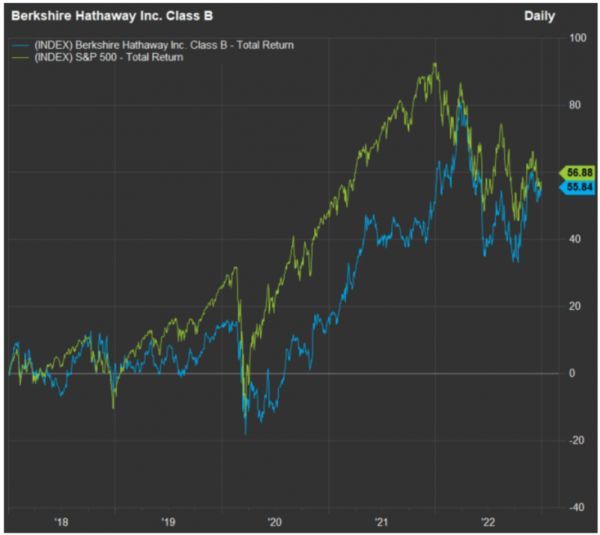 是的,伯克希尔的表现略逊于基准指数,但走势比较平稳。当标普500指数在2022年由于利率飙升科技股回调而下跌18.1%时,伯克希尔股票的同期回报率为4%。