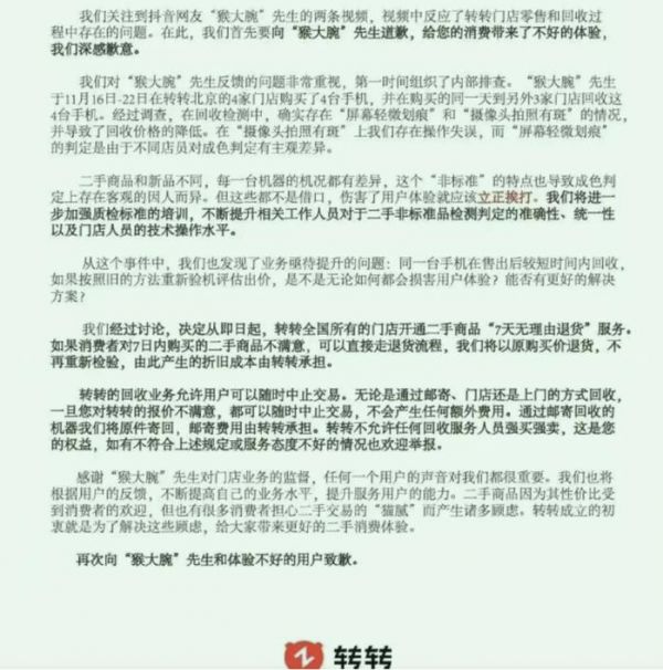 随后,转转作了可谓是一份“教科书”级别的危机公关文案:首先,向该网友道歉,在“摄像头拍照有斑”上,转转存在操作失误;其次,承认手机确实存在屏幕划痕及拍照有斑等问题,究其原因则是店员操作失误以及主观判断存在差异。最后为了表示歉意,即日起,全国门店开通“七天无理由退货服务”。对于转转发布的公关文案,很多消费者表示早就深受其害,而此次大网红爆出问题舆论扩散后,转转才开始正视问题,未免有些店大欺客。