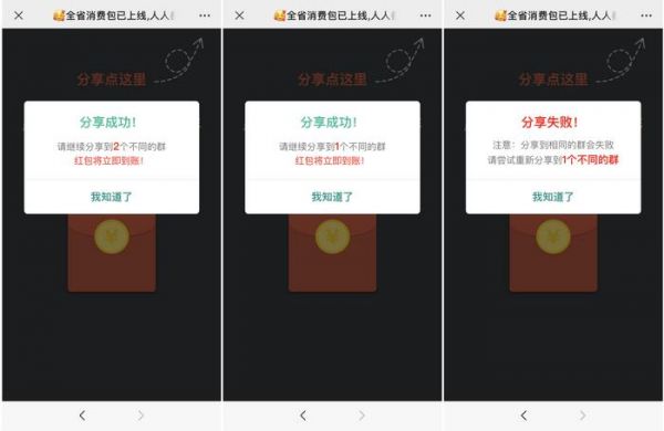 在点击此类红包后,页面提示需要转到其他微信群或分享到朋友圈才能领取。利用微信好友链进行传播,让用户大大降低了警惕,很多人出于对好友的信任,点击后继续分享给其他好友。加上红包流程繁琐,让很多人不愿意“前功尽弃”,造成恶性循环,传播量极广。