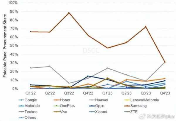 如下图所示,这是DSCC的数据,显示在2023年四季度,华为折叠屏手机出货量大增,份额超过30%,已经超过了三星,排名全球第一了。而三星在4季度大跌。
