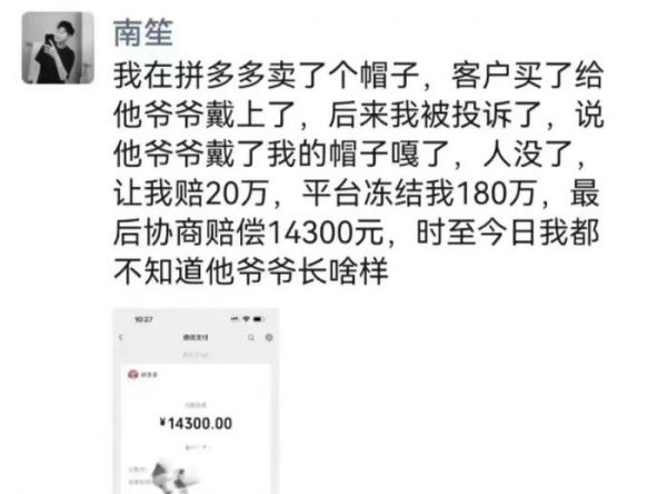 还有商家表示,自己是卖帽子的,结果用户买给他爷爷戴了之后死了。消费者把我投诉了,索赔20万,平台把自己的180万保证金都冻结了。经过协商之后,赔了14300元(真实性无从考证,且当段子看吧)。