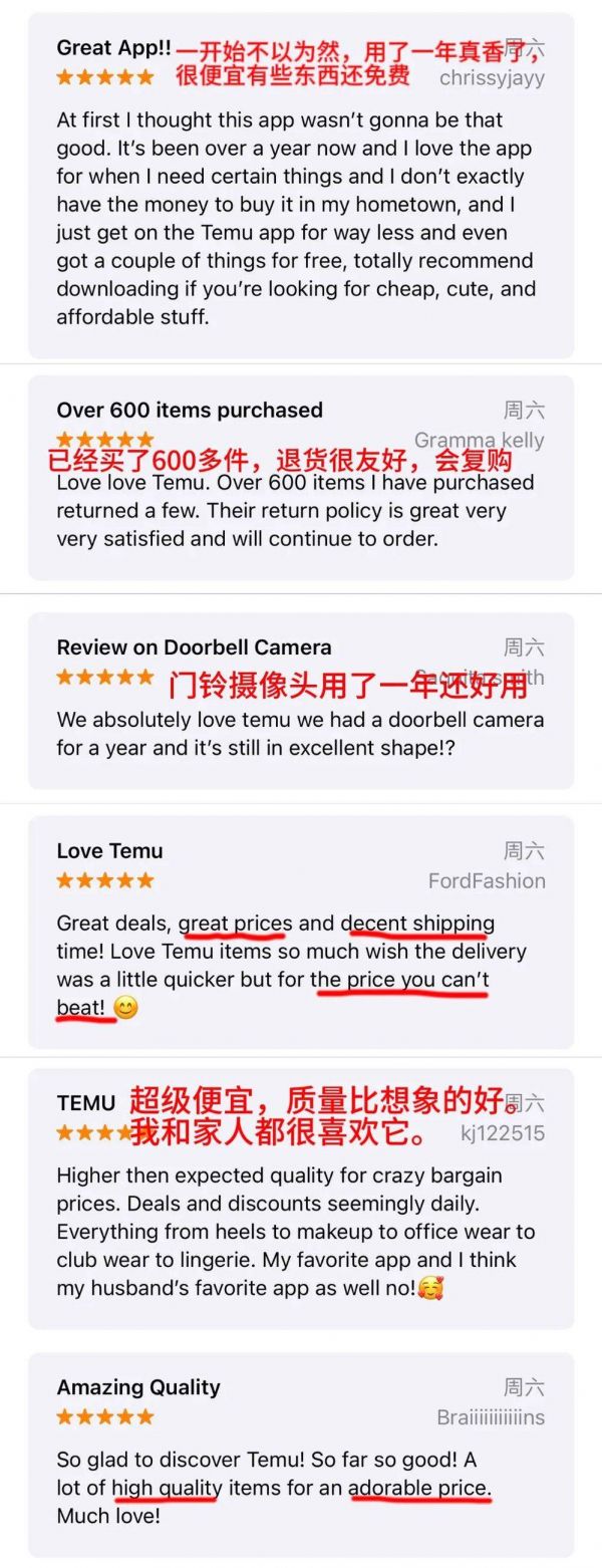“price”和“quality”是被提到最多的两个关键词。在持续高通胀的背景下,极致低价的同时保持质量可用,正是TEMU在美国最大的杀手锏。评论区中不乏黏性消费者留下的好评。