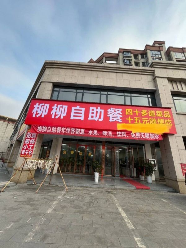 前几日趁着进城,我特意去看了看。饭店位于县城新建的大公园旁,地段不错。走近,门口大招牌赫然写着:“四十多道菜品,15元随便吃”“水果、啤酒、饮料畅饮”,颇有诱惑力。