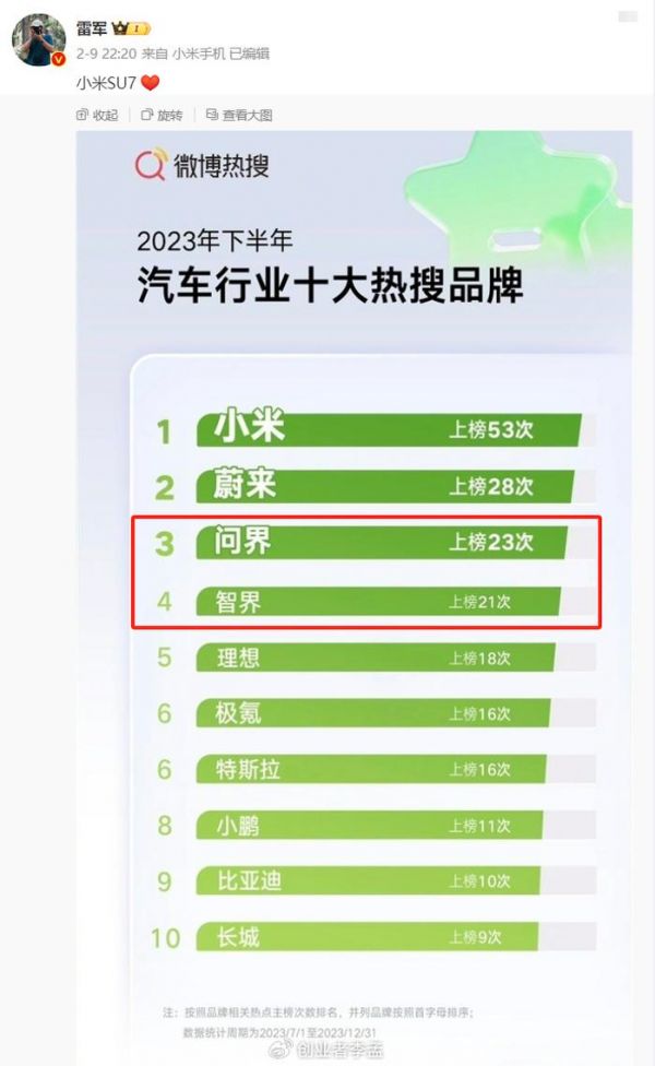 你说对立吧,其实用户之间没有冲突,只有网友和小米高管方面发起的PK,虽然小米汽车还没有发布,但是雷军最近发布了小米汽车的专利以及热度等方面数据,小米汽车成为了第一,华为问界好像排名在后面第三或者第四了,这也无形中在官方角度通过排名也在产生对比,用第三方角度来PK。