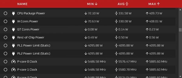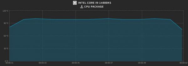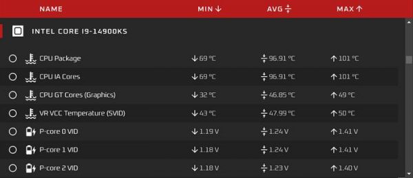 ▲ 功耗数据相对应地,频率越高,其功耗和温度也就越高,i9-14900KS 基础 TDP (PL1) 为 150W,而峰值功耗高达 410W,平均额定功率为 330W。在如此高的 TDP 下,该芯片的温度高达 101℃,其中 P 核最高达到了近 5.9 GHz。