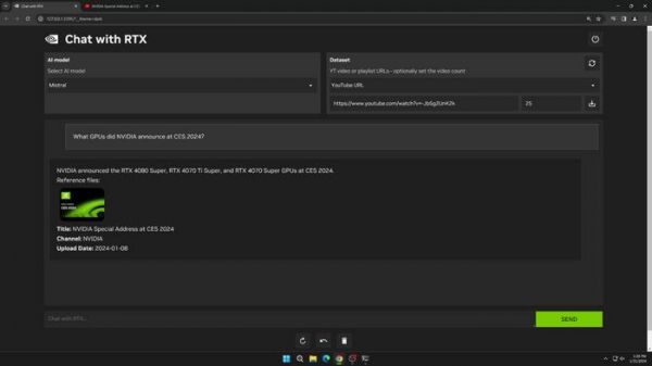 Chat with RTX 支持多种文件格式,包括文本、pdf、doc / docx 和 xml。只需将应用程序指向包含文件的文件夹,它就会在几秒钟内将它们加载到库中。此外,用户还可以提供 YouTube 播放列表的 URL,该应用程序将加载播放列表中视频的转录,使用户能够查询它们涵盖的内容。