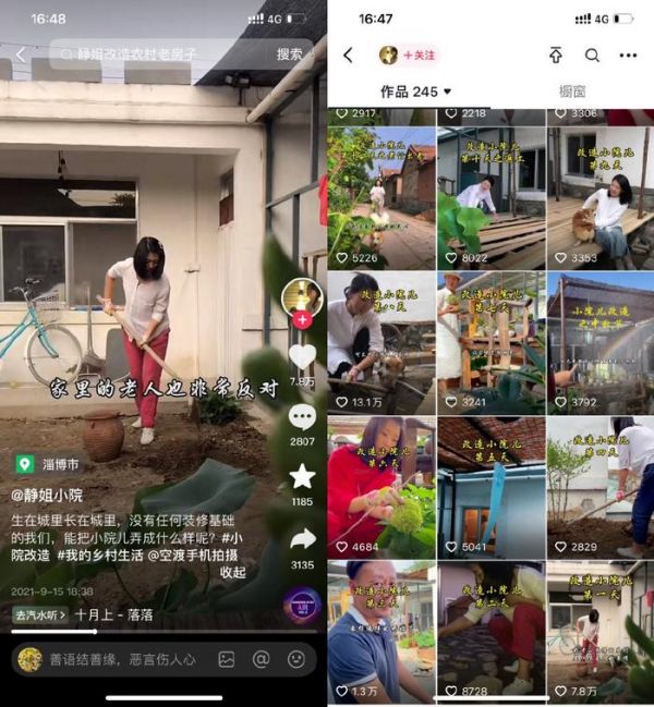 随着他们对于抖音的运营规则和技巧,以及短视频拍摄制作的手法有了一定积累,2021年9月开始改造屋外的院子时,他们决定要“正儿八经”地运营抖音,于是重新注册了账号@静姐小院,主题和内容就围绕院子的改造和自身的经历,结果账号的第一条视频就获得了几十万的播放量。