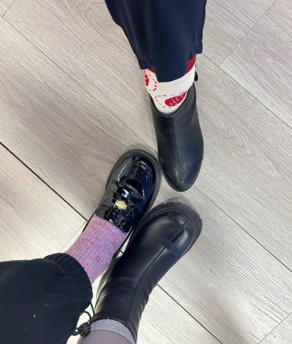 这种“恶心感”,大概源于因为穿了太多衣物而膨胀的身体,与没有特别“武装”的部位之间产生的反差,比如庞大的身躯下是一双纤细的脚脖,以及由于不注重搭配和美感带来的混乱,比如短裙下穿棉裤,小熊帽子搭配豹纹棉服、红袜子配皮鞋。