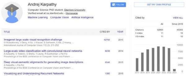 目前,在 Google Scholar 上,Karpathy 的论文引用数达到了 62969。其中,引用第二多、他作为一作的论文《Large-scale Video Classification with Convolutional Neural Networks》被收录为 CVPR 2014 Oral。
