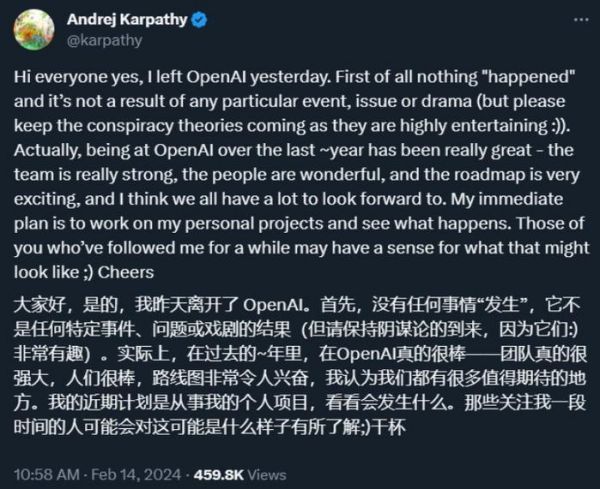 Karpathy在官宣离职的推文中写道,「是的,我昨天离开了OpenAI。首先,没发生什么特别的事情,这不是由于任何特定事件、问题或者争议导致的(但请继续提供阴谋论,因为它们确实很有趣 :))。实际上,在过去的大约一年时间里,在OpenAI的经历真的很棒——团队非常强大,人们非常棒,路线图也非常令人兴奋,我认为我们都有很多可以期待的。我的近期计划是致力于我的个人项目,看看会发生什么。那些关注我一段时间的人可能会对此有所了解。」