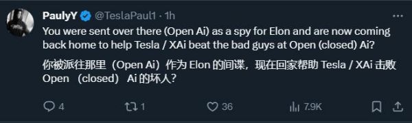 在Karpathy帖子的评论区,确实出现了一些比较有意思的「阴谋论」,比如有人说他是被马斯克派到OpenAI当间谍的,现在是时候回去了。