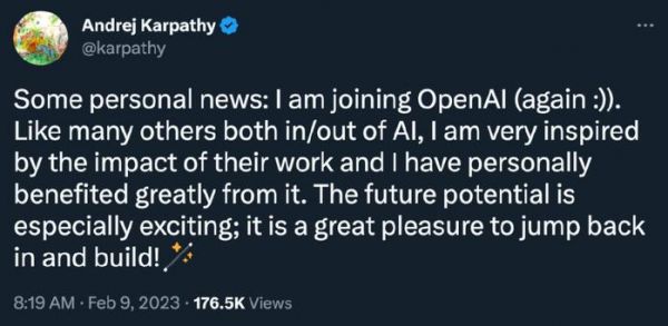 离职八个月后,2023年2月,Karpathy宣布自己再次加入 OpenAI。