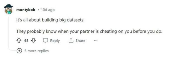 新西兰网友说,这些都是扯的,真正的目的就是一个:建立一个大型数据库,“他们以后可能会比你更早知道你老婆在骗你……”