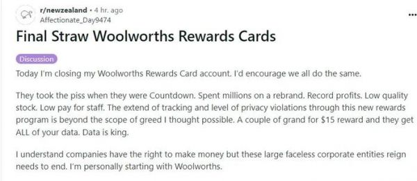 “他们花几百万纽币改名,创纪录的利润,员工工资低,而这次的忠诚卡计划跟踪和侵犯隐私的程度,超出想象的贪婪。用15纽币奖励,他们就能获得你的所有数据。