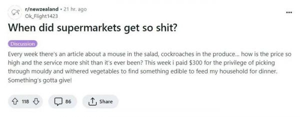 “每周都有关于沙拉里有老鼠、农产品里有蟑螂的文章......价格这么高,服务怎么会更差呢?这一周,我花了300纽币,买来的菜还有发霉和枯萎的,还需要挑挑拣拣才能供家人晚餐之用。”