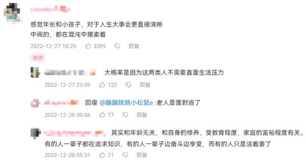某访谈节目邀请了从5岁到90岁的嘉宾分享人生难题,从涉世未深单纯得像一张白纸的孩子,到历尽千帆人生阅历丰富的老人,他们谈到了成长、财富、爱情、生死种种话题,有人评论“感觉年长者和小孩子,对于人生大事会更直接清晰,中间的,都在混沌中摸索着。”