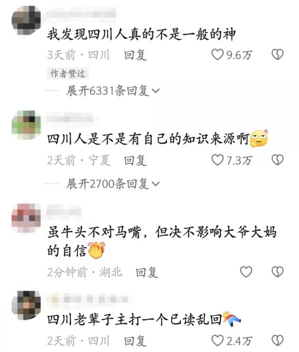 面对年轻人的提问,奶奶甚至不需要思考,斩钉截铁地给出了离正确答案相差十万八千里的回复,何尝不是一种已读乱回,甚至有网友表示“四川人是不是有自己的知识来源啊?”