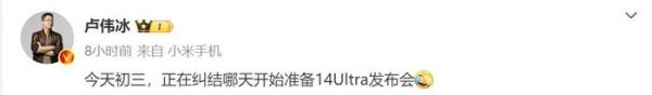 今日,卢伟冰开始预热小米 14 Ultra,表示 " 正在纠结哪天开始准备 14Ultra 发布会 "。